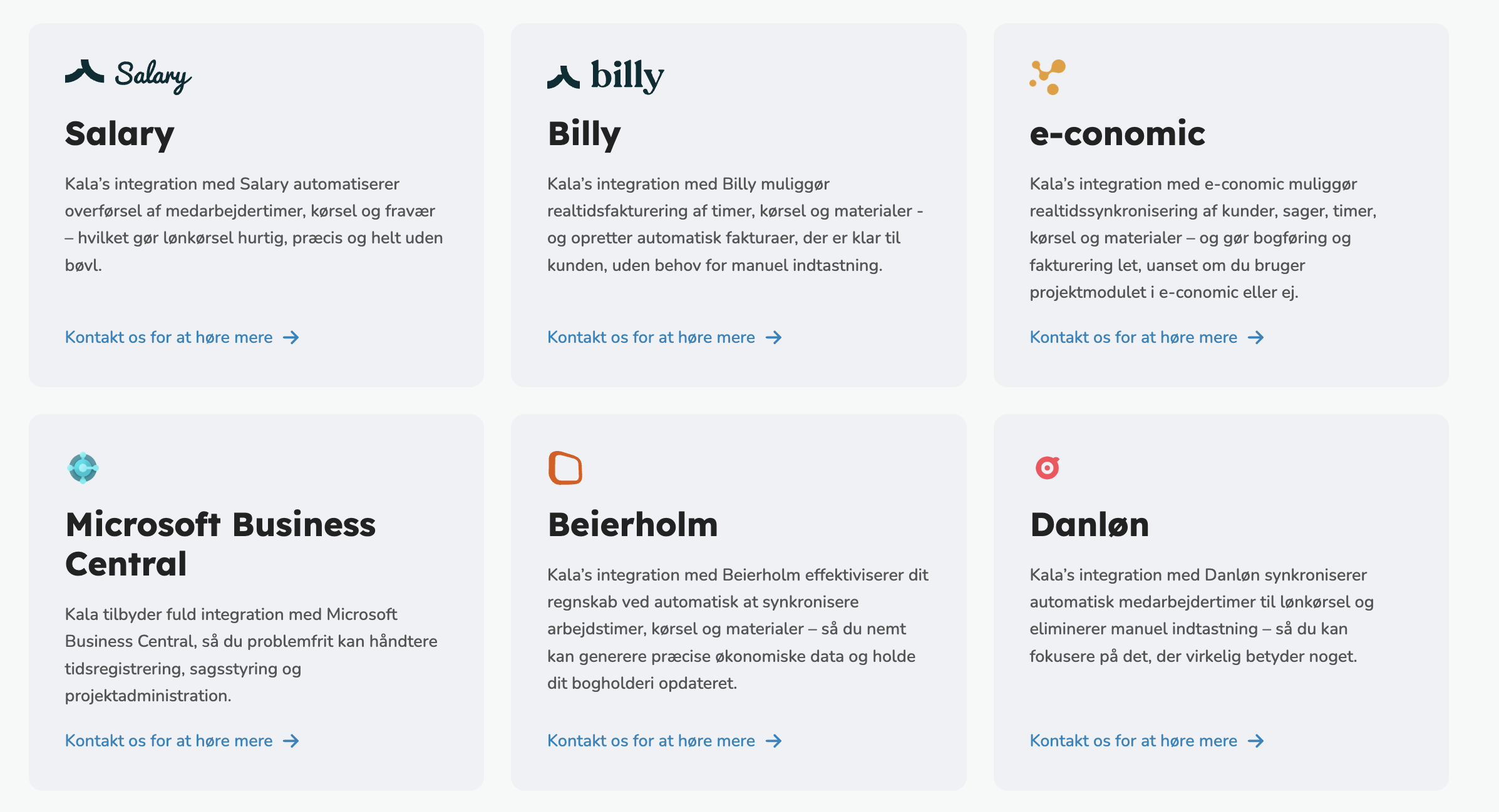 Vi udviklede hele kala.app websitet fra bunden med et custom WordPress theme og skræddersyet PHP. Sitet indeholder feature-sider, blog, dokumentation, integrationsguides, branchespecifikke landingssider og prisside — alt optimeret til konvertering og SEO. Custom post types driver features, integrationer og blogindhold, så Kala-teamet selvstændigt kan administrere indhold.